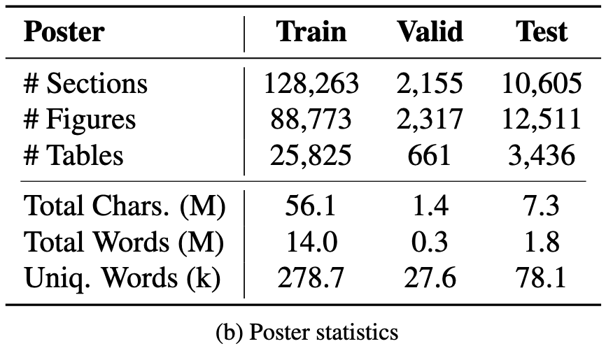 We constructed SciPostGen, a large-scale dataset consisting of 18,097 pairs of scientific papers and their corresponding posters. SciPostGen includes pairs collected from major computer science conferences and covers both landscape and portrait poster formats. To avoid copyright issues, we release only download scripts for original paper PDFs and poster images, together with corresponding annotation files.
